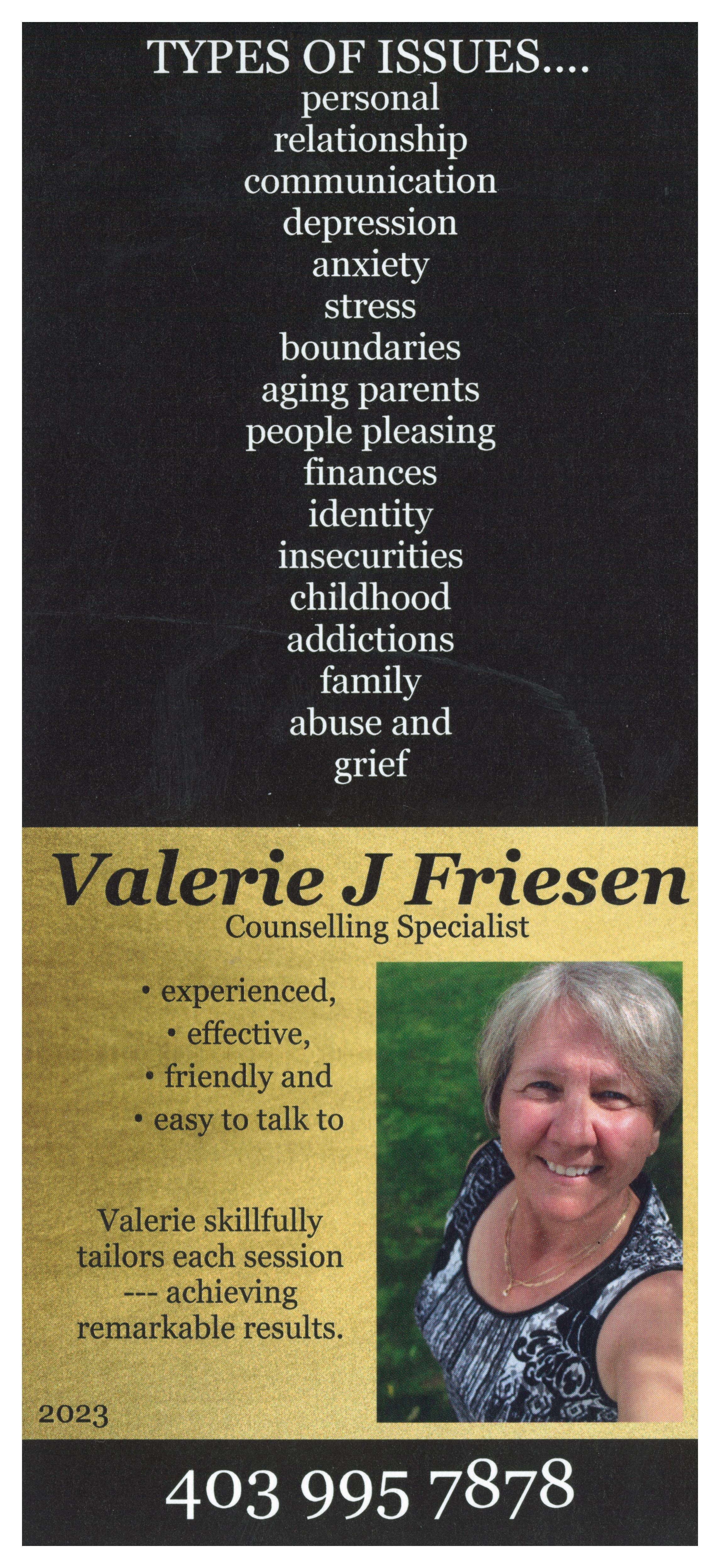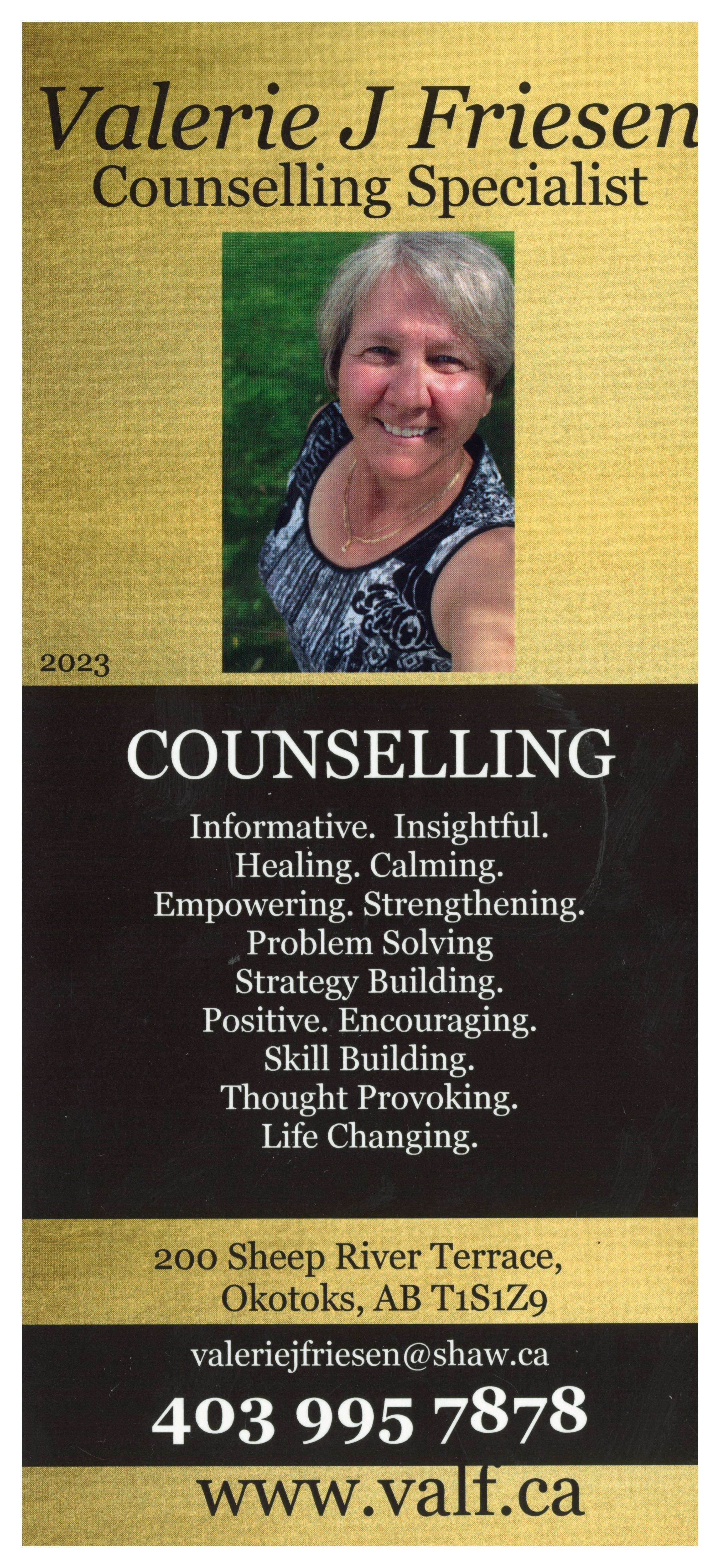 Valerie now lives in Okotoks, Alberta, has 32 years of Counselling experience and is semi-retired. Age 64.